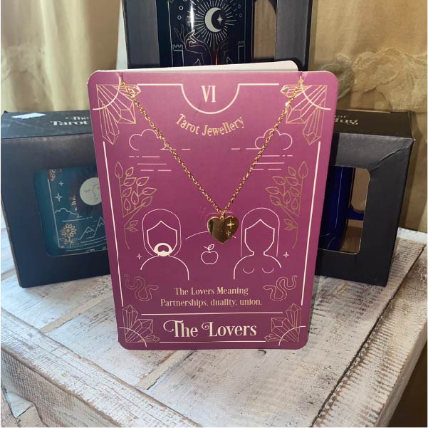 A mystical gold-tone heart necklace beautifully presented on a matching greeting card perfect for a gift.